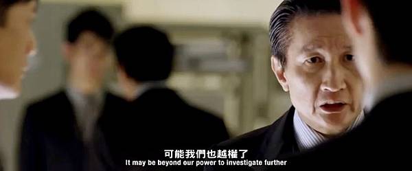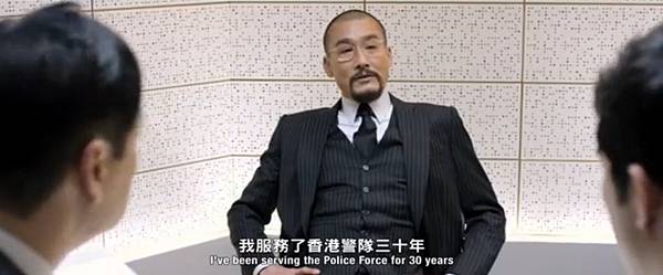 張國標(李治廷飾)之後又找李文彬(梁家輝飾)到署裡問話調查,事前已知李文彬(梁家輝飾)比劉傑輝(郭富城飾)老練十倍,果然真的hold不住場面,反被李文彬(梁家輝飾)hold住全場,這一段很好笑。