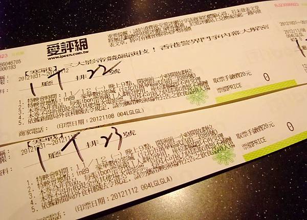 我們坐1廳T排22、23號,這個位子也不錯,如果能坐中間十幾號的座位會更好,1廳共18排,T排是最後1排。